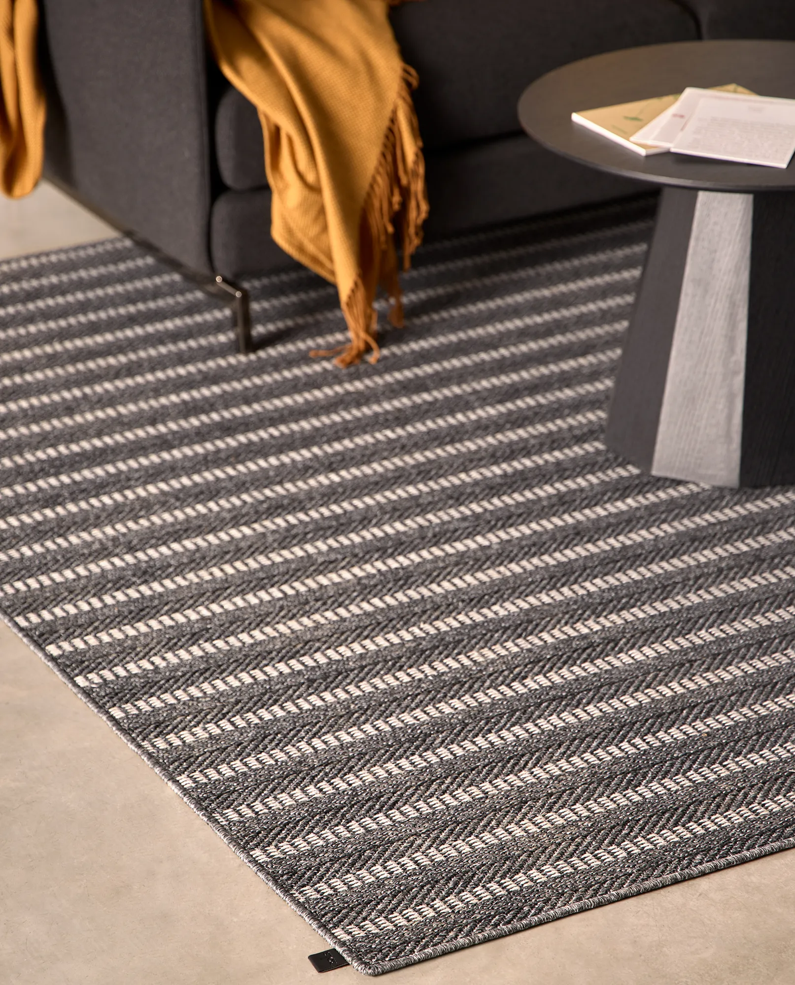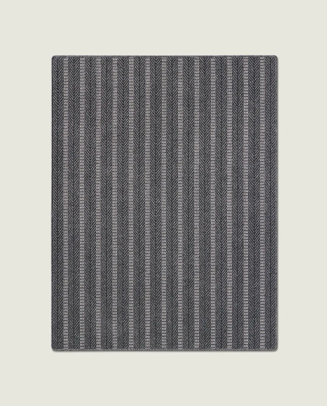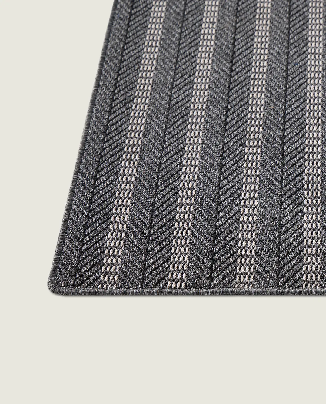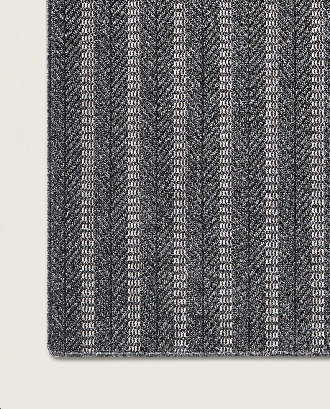 Dit geweven buitenkleed in grijs kenmerkt zich door een verfijnd visgraatpatroon, gecombineerd met lichte en donkere strepen. Het gelaagde lijnenspel geeft het kleed een moderne, licht edgy uitstraling, terwijl de neutrale grijstinten zorgen voor rust en balans. Hierdoor vormt het kleed een uitgesproken maar ingetogen basis binnen eigentijdse buitenomgevingen.
